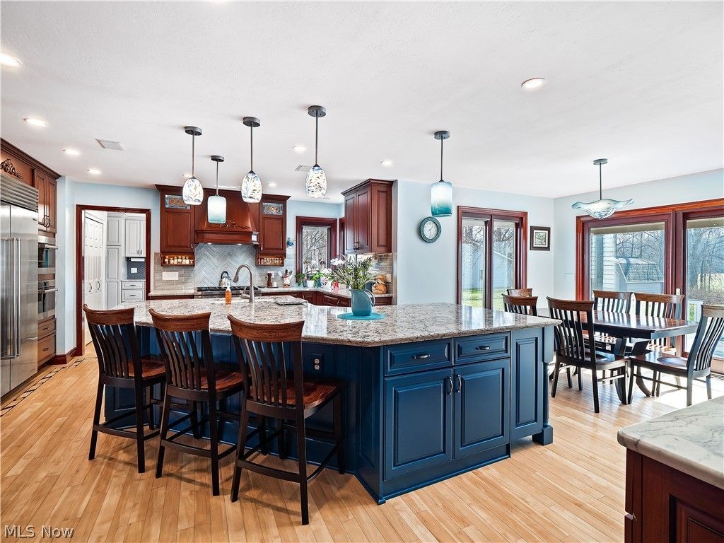 If you've been searching in the $700,000+ range in Avon, Westlake, or Strongsville and feel like your budget isn't going as far as it should, it's time to explore the Midview School District. This exceptional 4-bedroom colonial offers over 3,300 square feet above grade, plus an additional 1,100 square feet of finished lower-level living space. Nestled on 4 private, wooded acres in the desirable Flint Ridge neighborhood, this property provides a rare combination of space, privacy, and convenience?just 23 minutes from Cleveland Hopkins Airport. The custom-designed kitchen is a true centerpiece, featuring a large gourmet island, built-in wine rack, Sub-Zero refrigerator, Wolf gas range, additional wall oven, and built-in microwave. Expansive windows fill the space with natural light, creating a warm and inviting atmosphere. The first-floor primary suite showcases detailed artisan woodwork and includes a luxurious ensuite with soaking tub, walk-in shower, and heated floors. The two-story great room offers a gas fireplace with a striking brick surround and opens to a four-season sunroom that is both heated and cooled?perfect for year-round enjoyment. Additional highlights include a 40x44 outbuilding, ideal for hobbies or storage, and major updates such as a new algae-resistant roof on both the home and outbuilding (2022), Pella replacement windows installed over time, and an HVAC system approximately 9 years old. This is a rare opportunity to enjoy elevated living, privacy, and space?without sacrificing proximity to the westside suburbs.