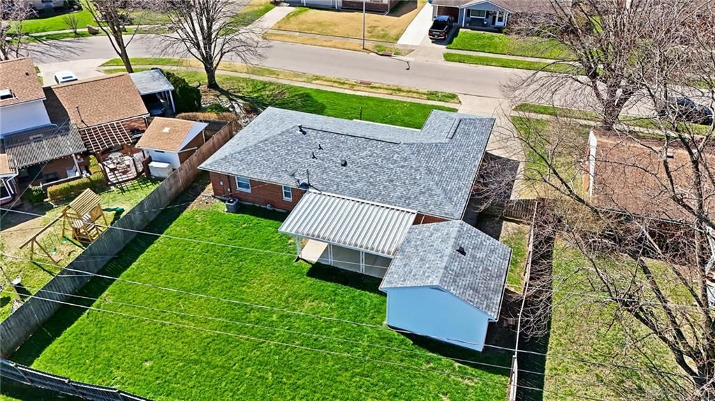 Welcome to this beautifully refreshed 3-bedroom, 2-bathroom brick ranch offering approximately 1,300 square feet of comfortable single-level living in a quiet, convenient neighborhood. Step inside to discover brand-new luxury laminate flooring flowing seamlessly through every room, complemented by fresh interior paint and crisp new baseboard molding. The bright, open layout connects living spaces effortlessly, with a generous family room just off the kitchen—perfect for entertaining or casual gatherings. The kitchen boasts ample cabinet and counter top space, and includes all major appliances: refrigerator, electric range, & dishwasher. Washer, and dryer space in hallway. Three well-sized bedrooms each offer ample closet space, plus two full bathrooms—one with a shower, one with a tub. Additional storage includes two hallway linen closets and a coat closet near the front door. Outside, enjoy a spacious fenced backyard with privacy fencing on three sides. Relax on the covered front or back concrete porches, or utilize the side concrete pad—ideal for an extra vehicle, camper, or trailer. The attached garage features a built-in storage closet and newer garage door opener. Off the patio, a versatile addition with garage/shed/living space is perfect for a secluded home office or workshop. A large two-room shed with electricity and pull-down attic access rounds out your storage options. Recent updates include new vinyl soffits, an updated electrical breaker panel with whole-house surge protector, and a radon mitigation system. Gas heat, electric appliances, and city water. Conveniently located near shopping, dining, a movie theater, and grocery stores—this move-in-ready ranch delivers comfort, function, and location. *Virtually staged for possibilities*